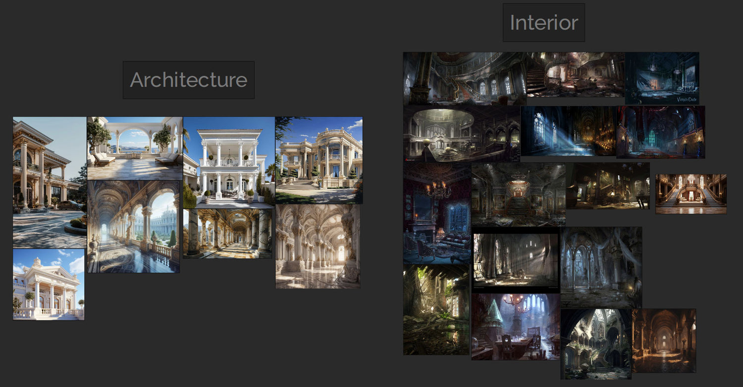 I also got some references for the architecture and interior design. To contrast the deterioration of the buildings, I want them to seem like they were once grand and majestic with large marble pillars and beautiful architecture.