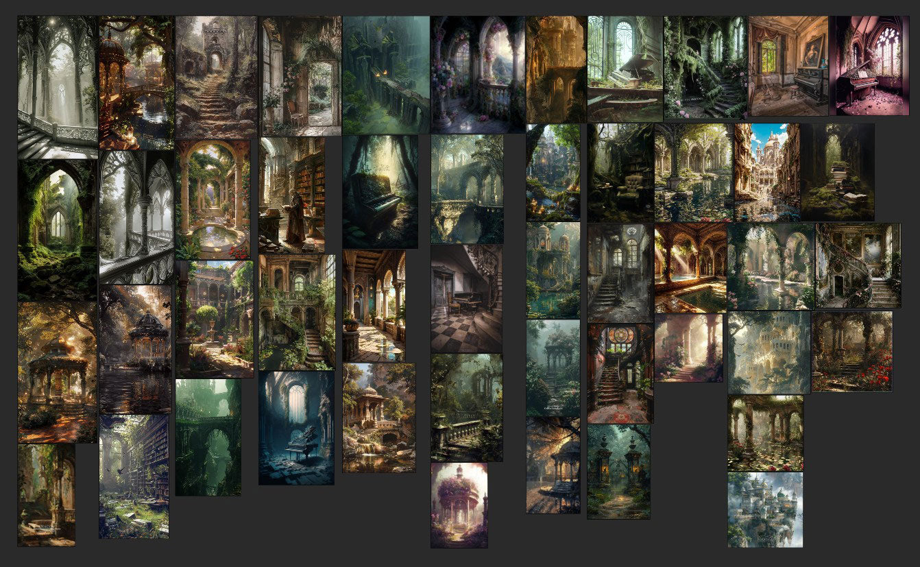 These images show how the scene will look after the transformation – bright, colourful, overgrown, magical etc.